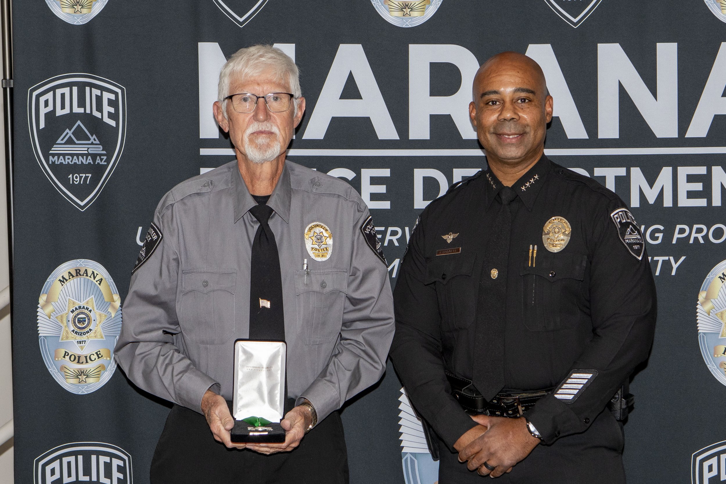 Marana Police Volunteer Gary Johnson with Chief Pridgett